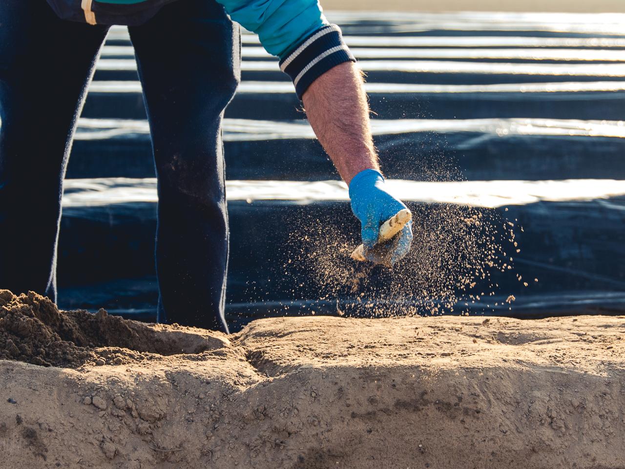 Hand steekt een witte asperge uit zandbed tijdens aspergedag op het veld