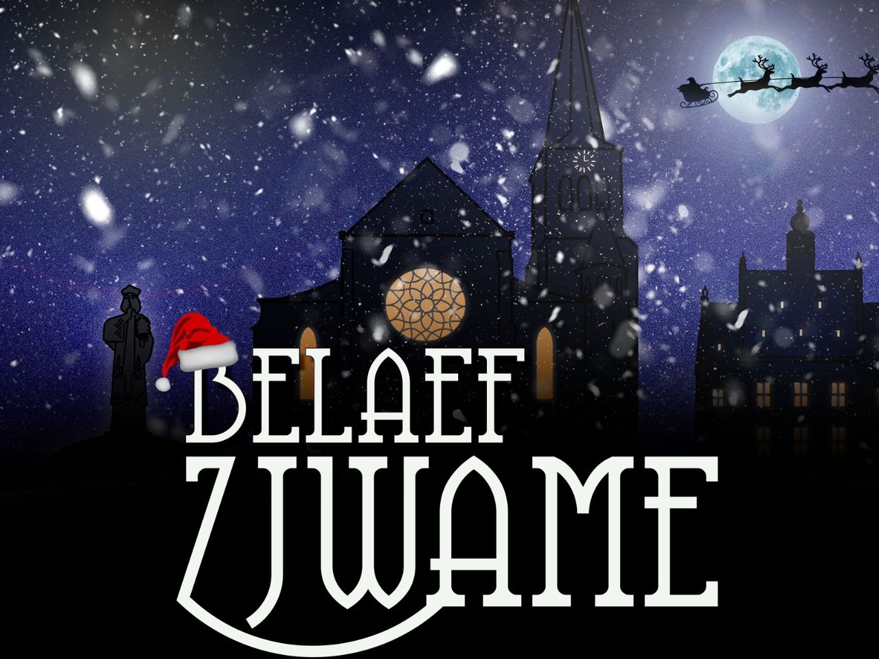Winterse sfeerimpressie van Bélaef Zjwame met verlichte gebouwen en sneeuw, promobeeld voor kerstmarkt Swalmen.